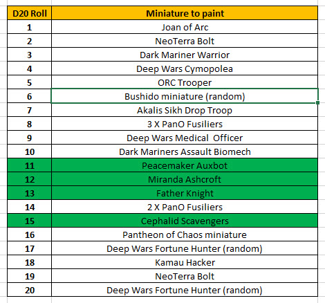 The D20 Table was basically an idea I had to make the selection process for my painting a little bit more fun, and to enforce some variation to keep the interest going. It’s a simple idea, I created a table in Excel with twenty line items which are all minis from games that I play/are about to play. The 1-20 obviously corresponds to the dice roll that randomly selects what i’ll be painting next. I’ve been using it for the last few weeks, and here is what I have struck from the list so far: