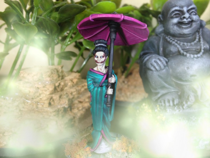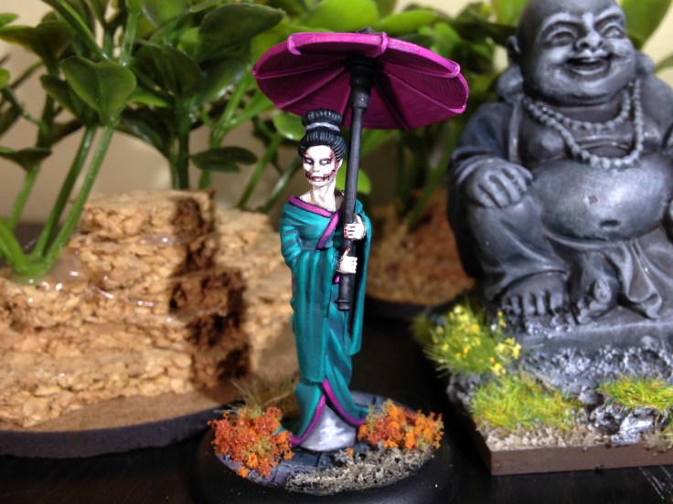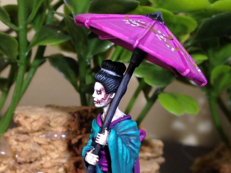 I did toy with the idea of putting a pattern on her kimono, but decided against it, and opted for simplicity, and just going for a design on her parasol instead. I made her face slightly paler than the rest of her skin, as a sort of ‘it could be makeup or could be a mask’ feel, emphasizing the facial wounds and stitches. I painted the eyes completely over with a pale blue, and highlights white to give that supernatural feel to her.