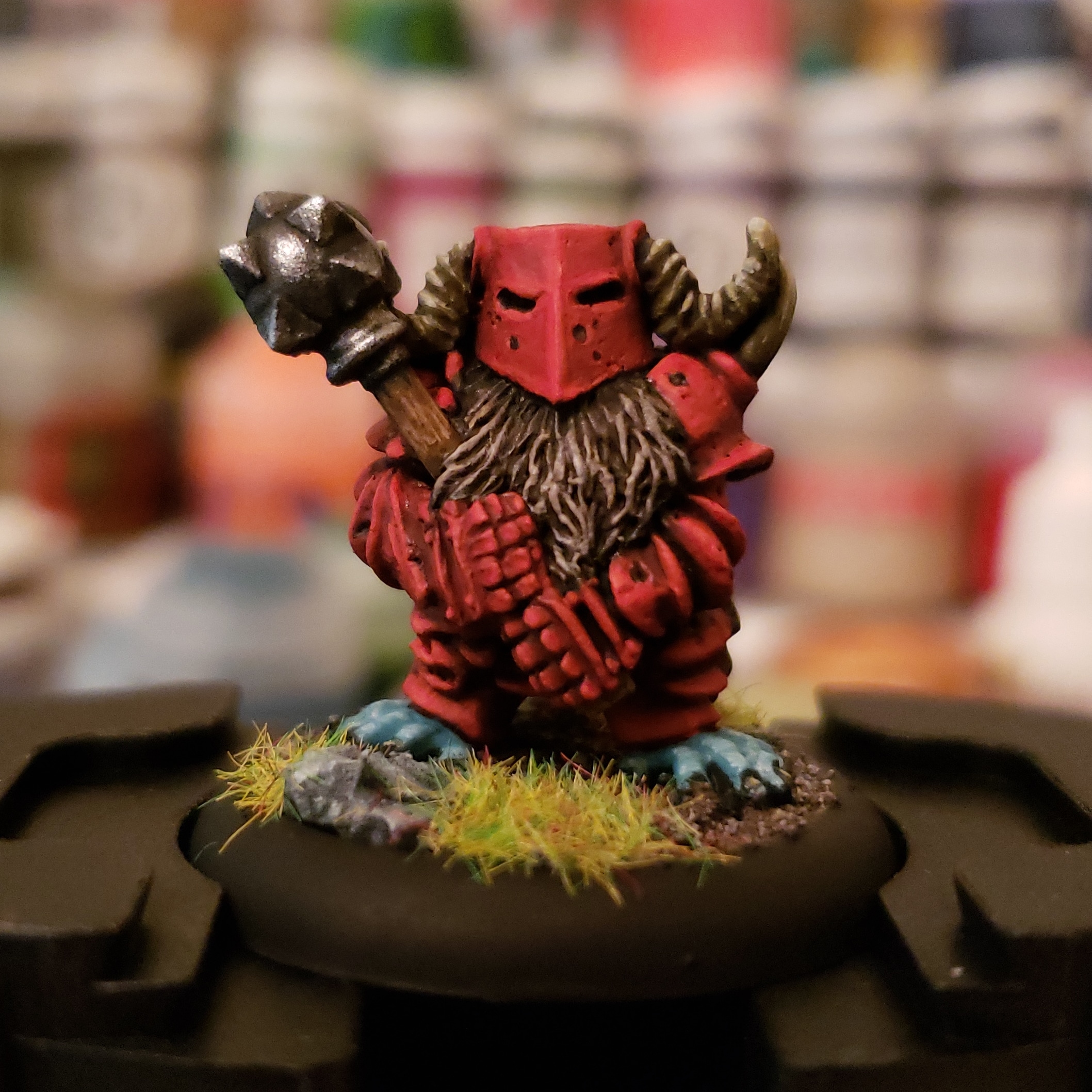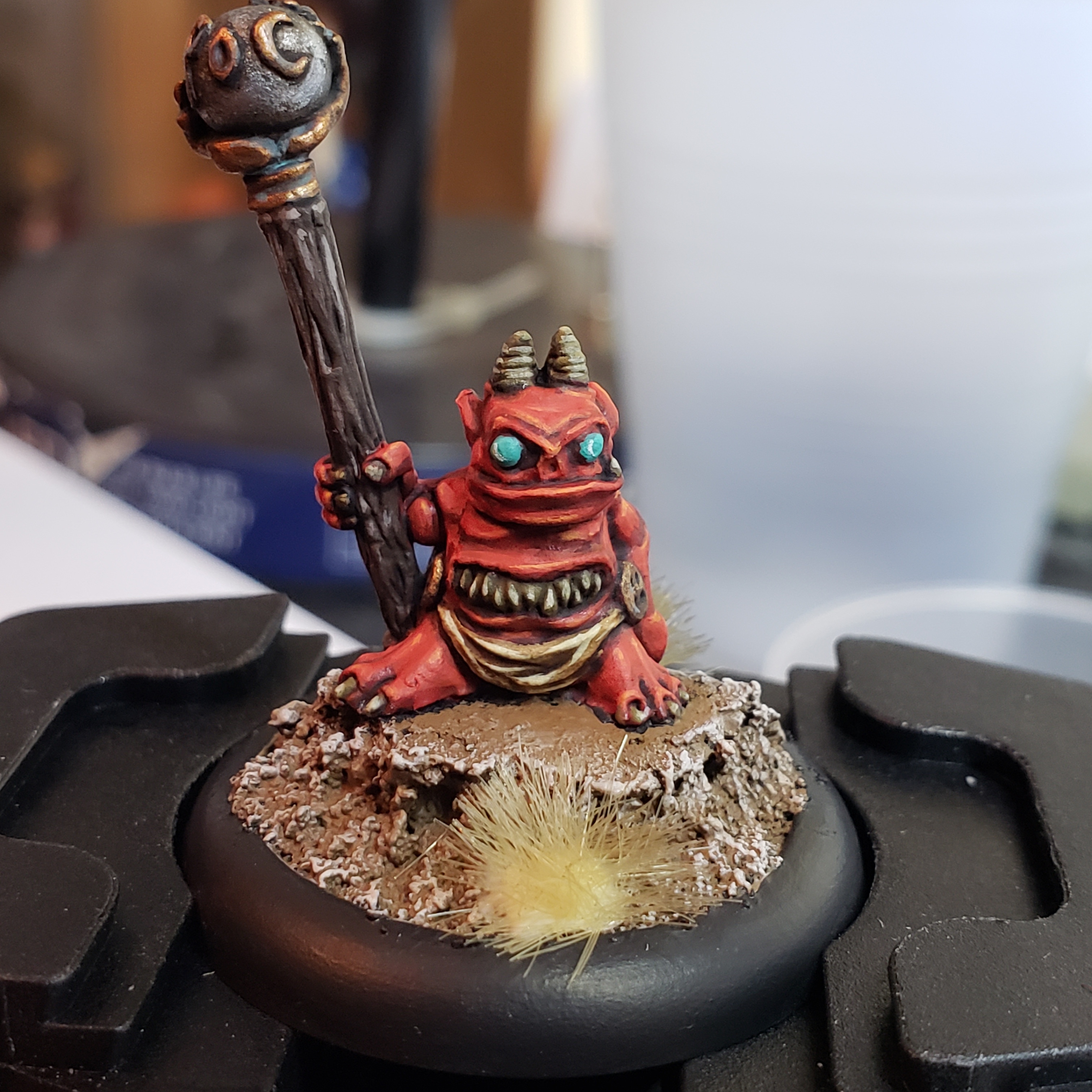 So far I’ve managed to get 2 figures painted up, a Chaos Dwarf (who looks like he could easily hang with the old GW Chaos Dwarf Renegades) and a little imp who could be quite comfortable amongst the old GW familiars.
