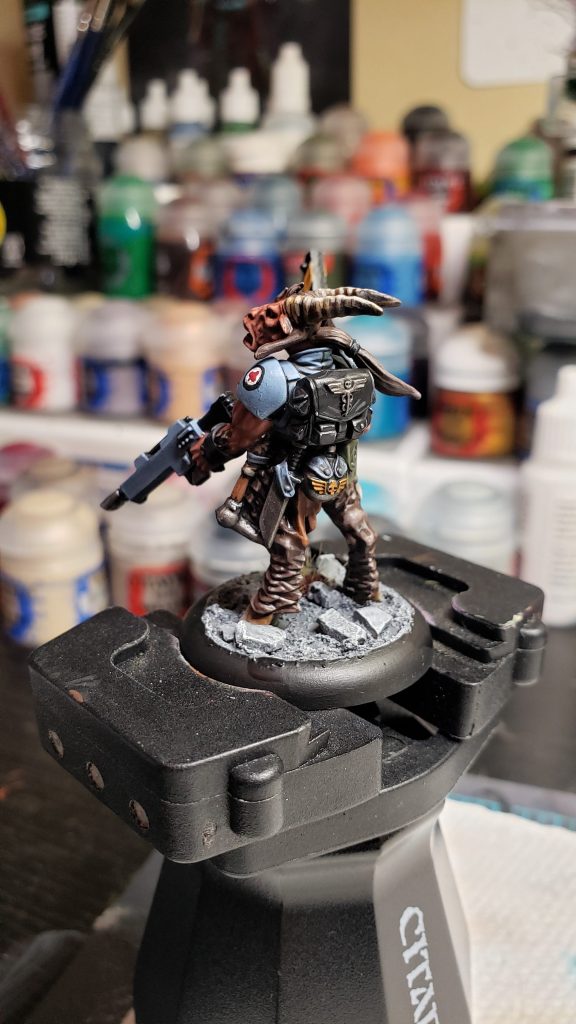 I believe Games Workshop produced two Guard beastmen in 40k scale*. This guy is clearly meant to be an “officer” hence his potent weaponry (but little in the way of armor. Again, to hell with canon and logistics!).