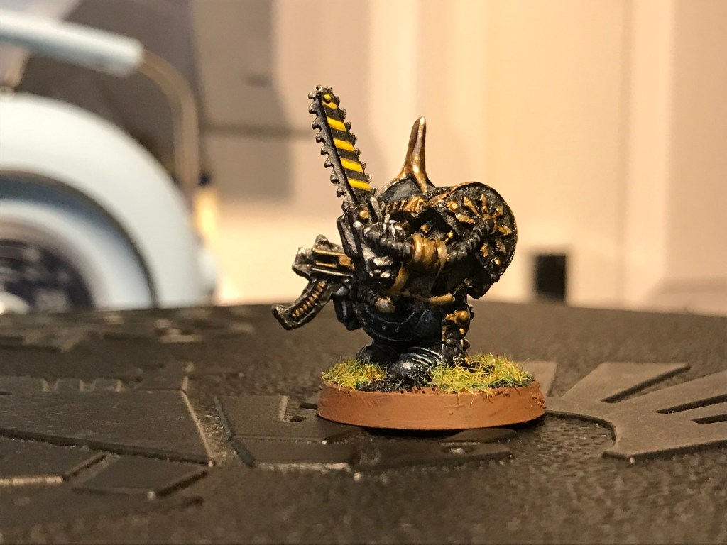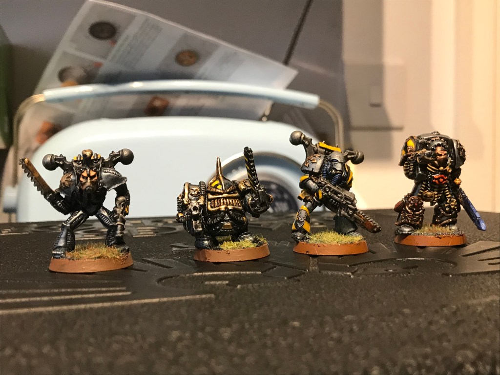 So that positive note brings us to this post’s miniature: the Chaos Squat in exo-armor! I’ve had this guy for an eternity and really hadn’t known what to do with him. Like all modelers I have a horde. A huge, huge horde. (These days we call it a pile of shame, Matt. Just sayin’… – Ed). Some years ago, I painted an old chaos marine as an Iron Warrior, and he was part of a narrative campaign where he had to help steal a Baneblade. After completing this chap, I painted an old chaos terminator, and then another ancient chaos marine. This got me thinking: maybe I should pull together a small iron warrior war band of around ten ‘oldhammer’ metal figures? The prospect seemed like a fun one.