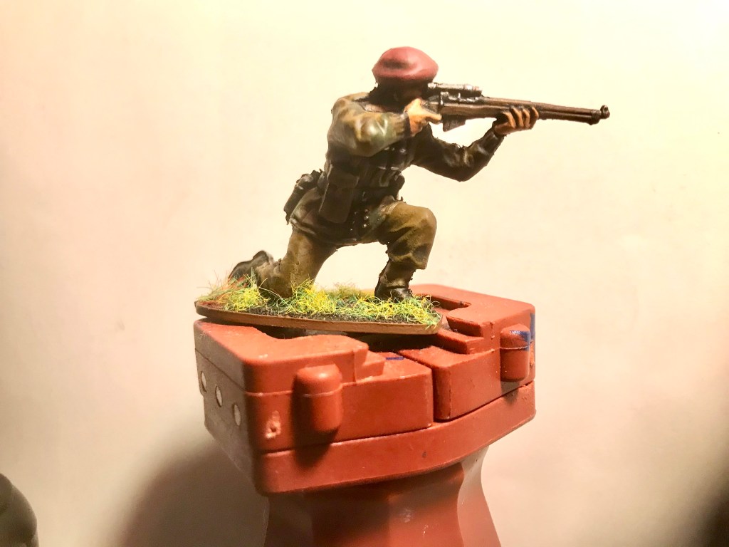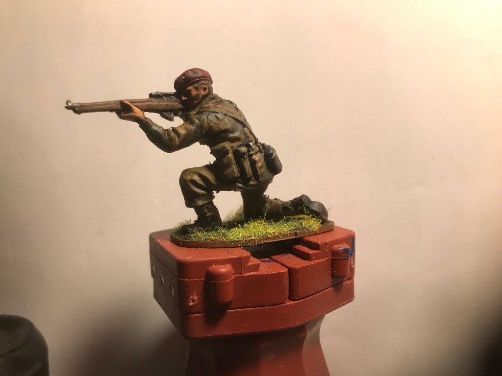 All that said, I was desperately in need of good paint colors for these chaps. Step up Warlord Games in Nottingham who offer paint sets for various armies. Now I know that’s nothing new, however Warlord offer what I call ‘non partisan paint sets’ meaning you get the best color for the job irrespective of manufacturer. Equipped with the tools of my trade I set about preparing the models. I picked two to start with: the crouching sniper with iconic beret and a standing rifle armed para with helmet. After giving them a good bath as they appeared very shiny and a little greasy the files and scalpel came out to clean up some fairly obvious mold lines and injection plugs. I undercoated my usual black and set about base coating.