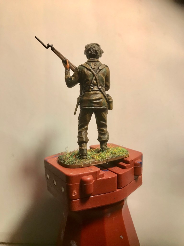 It’s fair to say that time hasn’t been entirely kind to these old minis whilst they still look good detail wise but they are inferior to todays modern war gaming minis. With this in mind I decided to use the time-honored skill of dry brushing to enhance the detail. As always I used my go to wash of Devlan Mud (really? you still have some? It’s Agrax Earthshade these days mate! – Paul) to again look to enhance the detail. The Denison smock was a curious thing to paint and I undertook a lot of research to try and get the patterns right dry brushing that proved challenging!!!!
