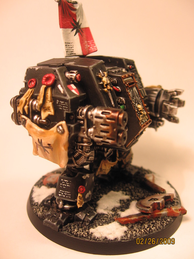 I have started working on my Black Templars Dreadnought. I had already painted the one arm, but was not happy with the highlighting, so I went over it all again last night. I only painted a small part to get a feel  for the black highlighting process. Now that I have a formula I am happy with, I will continue with the rest of it. In the meantime, here is what I have done: