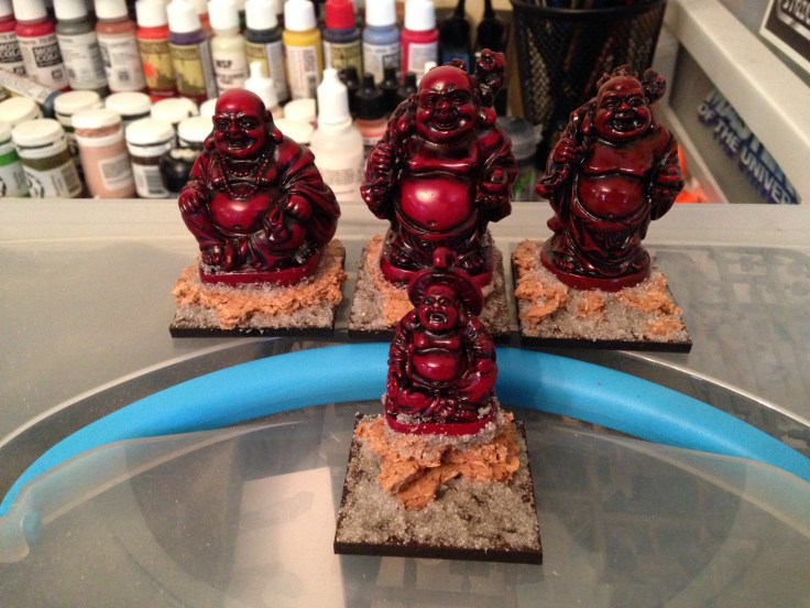 I was in Chinatown over the weekend with the family, and I picked up a handful of the little red Buddha figurines, thinking that they may work quite well as objectives or just straight up scenery for Bushido.
