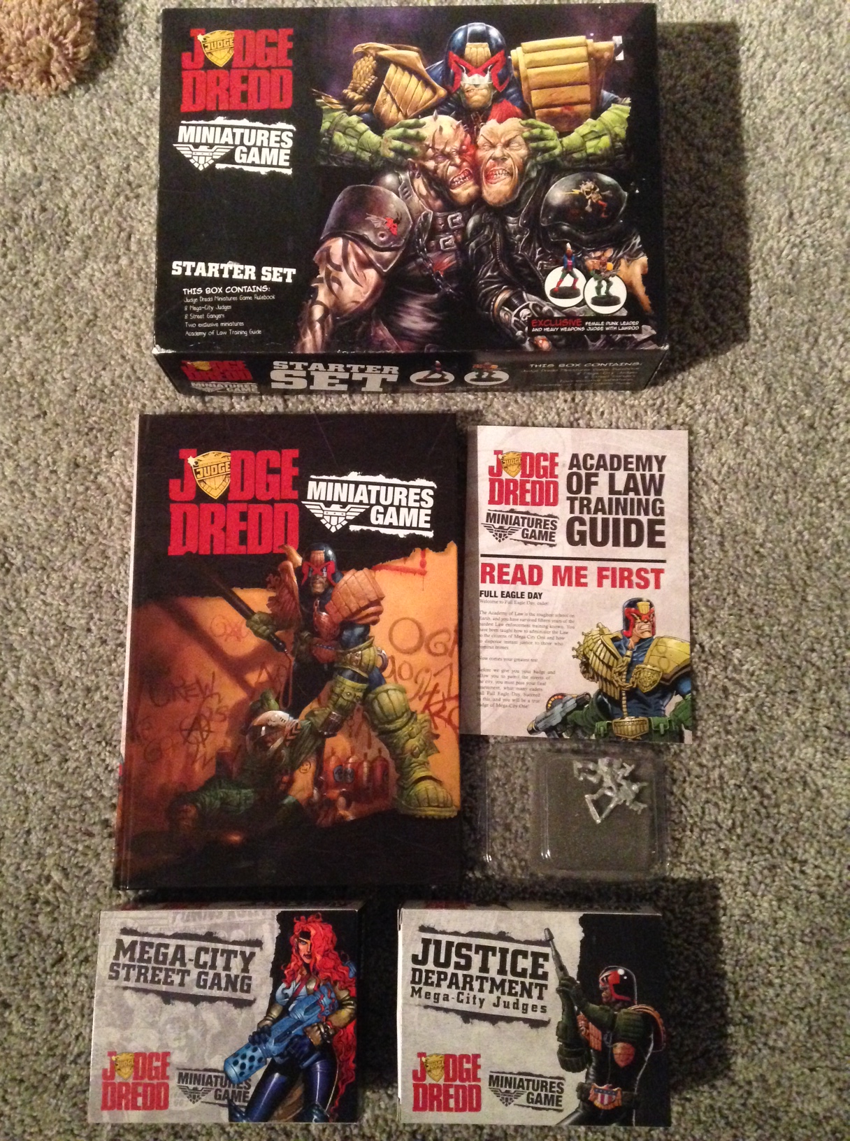 A while back I downloaded some test rules for the Judge Dredd Miniatures Game (a Warlord Games/Mongoose Publishing collaboration) and that was it, I saved it to my computer and pretty much forgot about it. At that point the only people making 2000AD miniatures was (and they still do make them) Wargames Foundry. Initially I was going to put together a couple of factions, but then realized that it was going to cost quite a bit for the miniatures and so put it on the back burner. Fast forward to a couple of months back, I saw a copy of the starter set at my FLGS and thought “fug it” and bought a copy. Not cheap, I will say, coming in at a cool $120. I’ve seen it about $100 on ebay, but guess what, yep, they charge you $20 for shipping, so do the math. So what do you get for your money? Is it worth it? Let’s take a peep in the box (hehe):