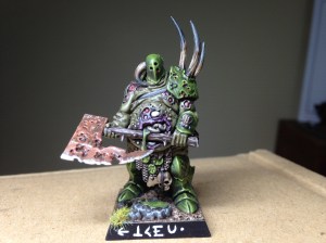 Another quick post today to share my newly finished Nurgle Plague Lord. I started this guy a couple of years ago, and then he got shelved when we moved, so I’m finishing up the few figures that are half done. I went old skool on this guy with the Dark Tongue runes on his base: